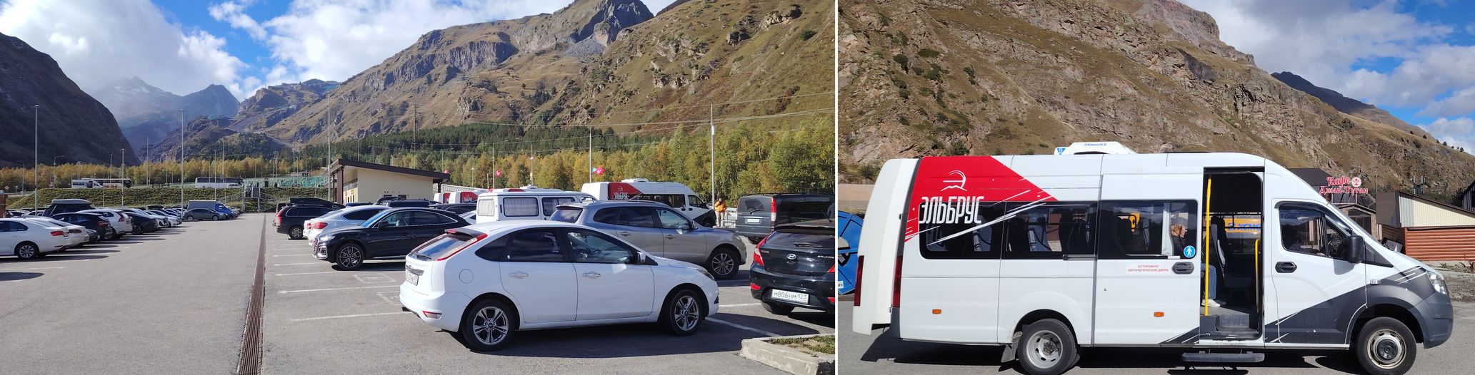 На въезде в Поляну Азау находится парковка курорта «Эльбрус», способная вместить до 800 автомобилей. Для удобства гостей от парковки к подъёмникам курсируют бесплатные шаттлы, поездка на которых занимает всего 3 минуты. На территории парковки можно приобрести билеты на канатную дорогу, зарядить электромобиль, арендовать горнолыжное или туристическое оборудование, а также воспользоваться уборными. Для людей с ограниченными возможностями предусмотрены специальные парковочные места. Первые 10 минут пребывания на парковке бесплатные, затем стоимость составляет 200 рублей за 2 часа, 300 рублей за 4 часа и 400 рублей за сутки.