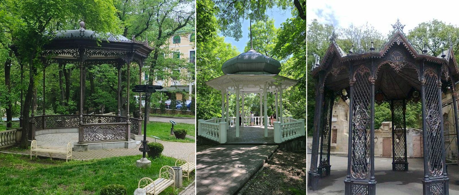 Не менее интересны архитектурные памятники парка, которые переносят посетителей в эпоху благородных дам и отважных кавалеров, романтических встреч, дуэлей, страстной любви и разбитых сердец. Туристы с удовольствием посещают беседки «Ротонда», «Случайные встречи» и «Ореанда», где можно ощутить атмосферу прошлого. Популярна и ажурная беседка «Рококо», где когда-то проходили концерты под открытым небом для знати, наслаждавшейся отдыхом на курорте.
