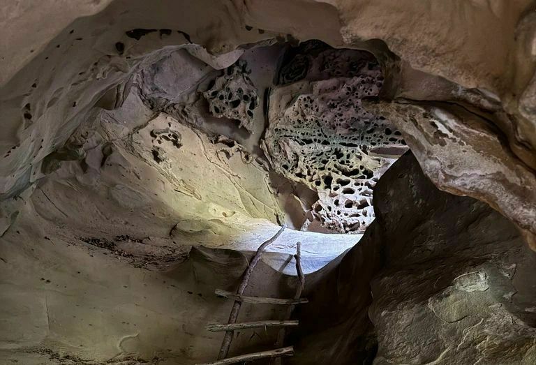Внутри пещеры пол, покрытый рыхлым желтым песком и опавшей листвой, круто уходит вверх. Сквозной грот имеет второй выход, который можно достичь по грубо сколоченной деревянной лестнице. Однако этот выход ведет к обрыву и пропасти, что добавляет таинственности и опасности этому месту. С вершины грота открываются захватывающие виды на село Хамышки, реку Белую, окружающие леса и горы.