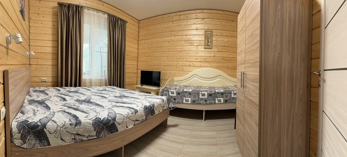 Домик со всеми удобствами. В доме две спальни, в каждой по двухспальной и односпальной кровати, телевизор; кухня со всеми необходимыми принадлежностями и телевизором; санузел, душ, терраса. В доме своя банька - 2000 руб (три