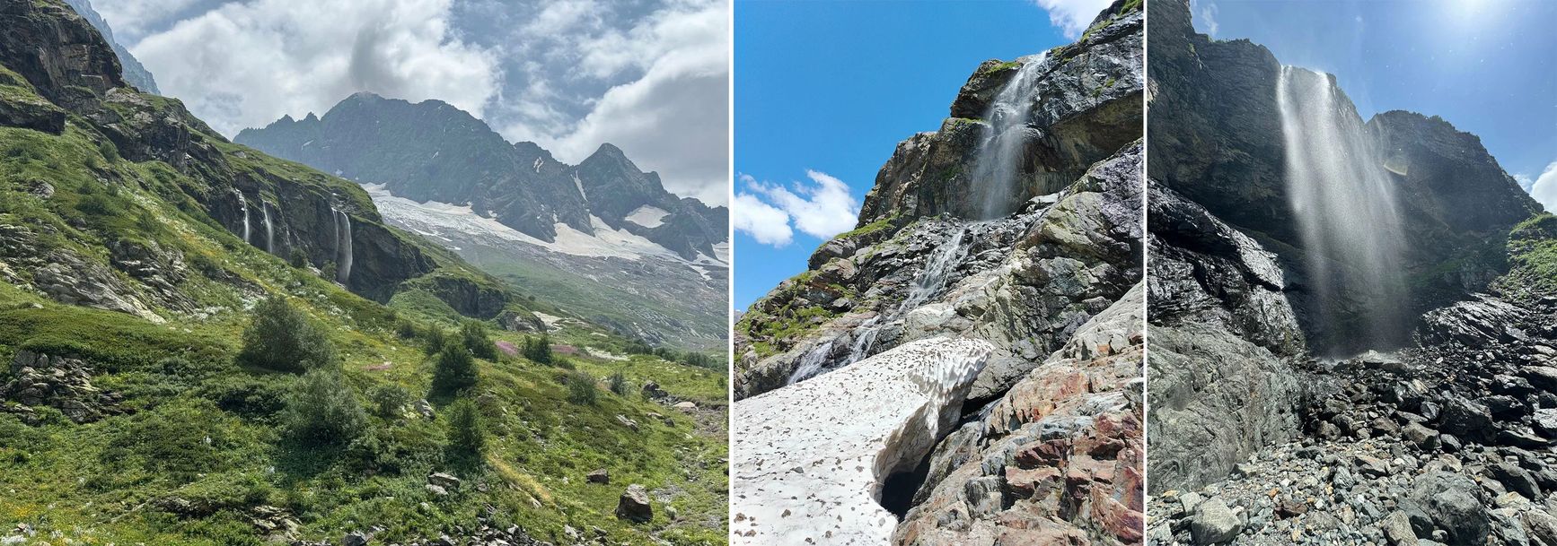 В конце пути на скалах слева можно увидеть Птышские водопады, образованные водами реки Северный Птыш. К ним можно подойти вплотную. От водопада до ледника и перевала, за которым начинается Абхазия, рукой подать. Множество ручейков стекают со склонов, образуя ниже бурную реку Северный Птыш.