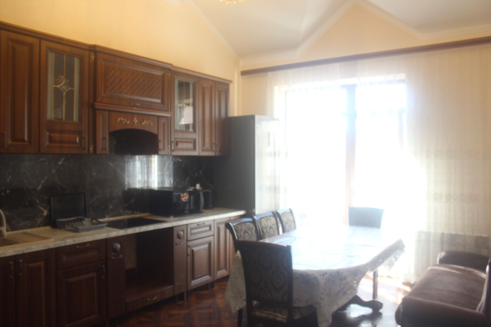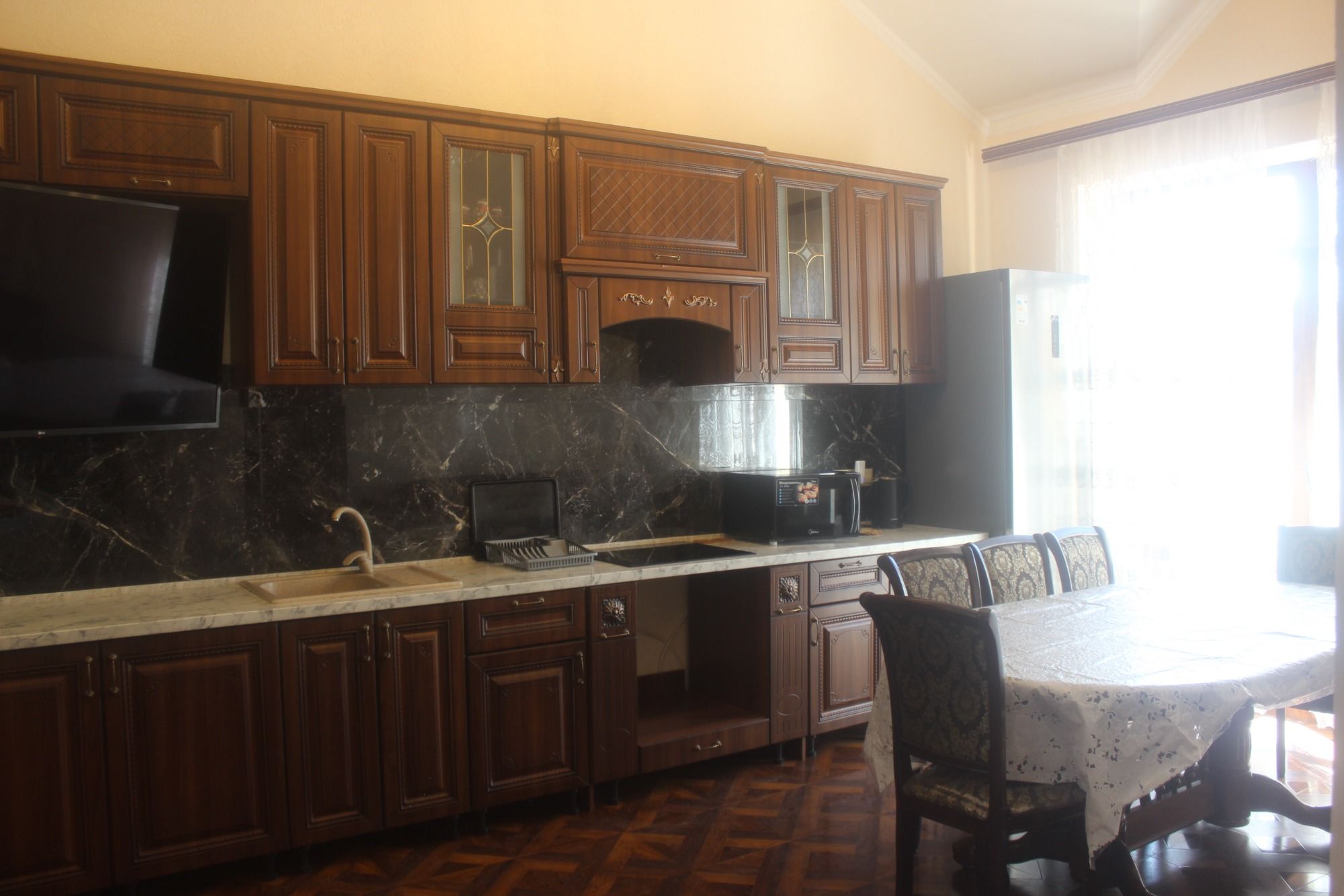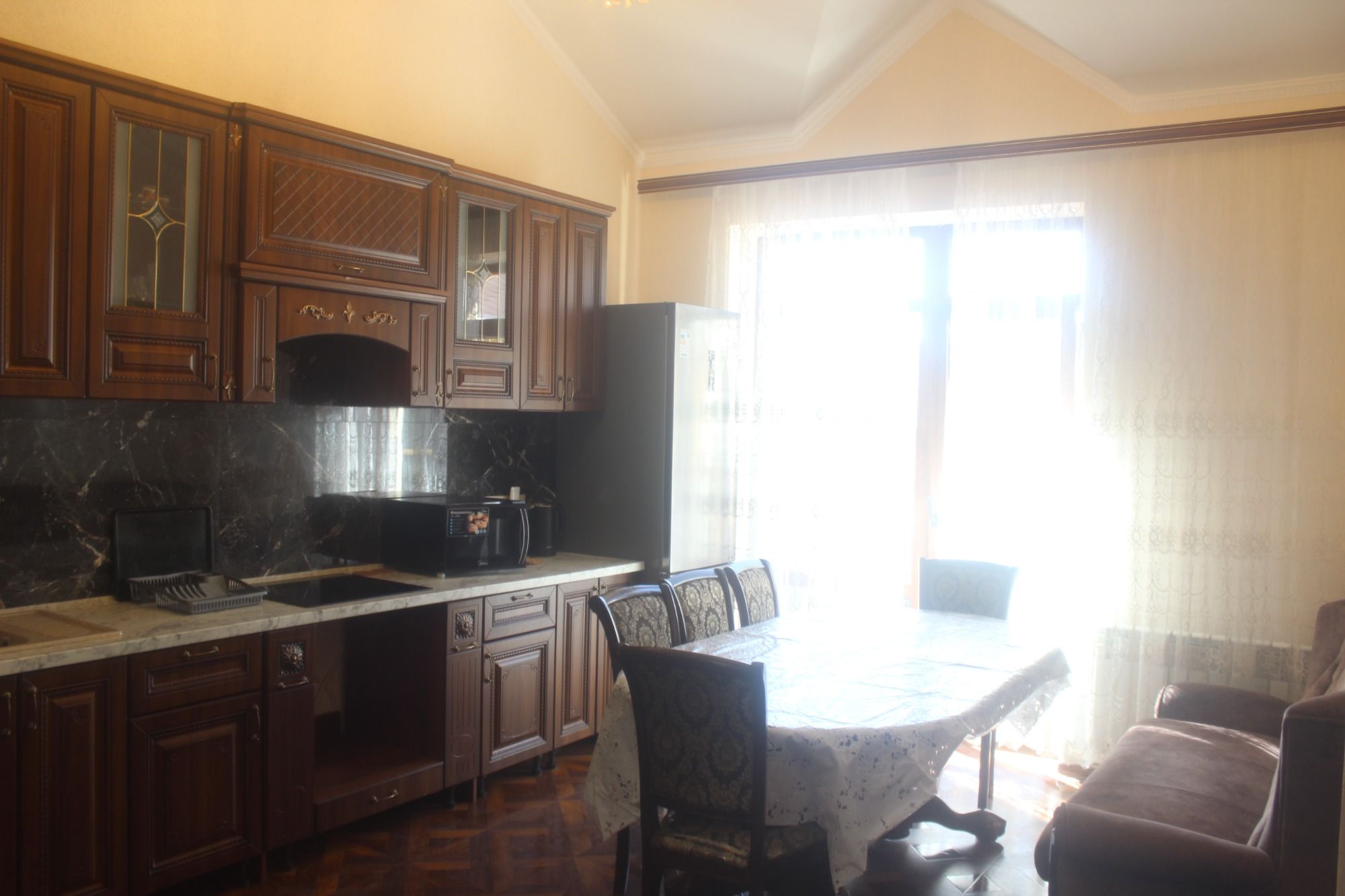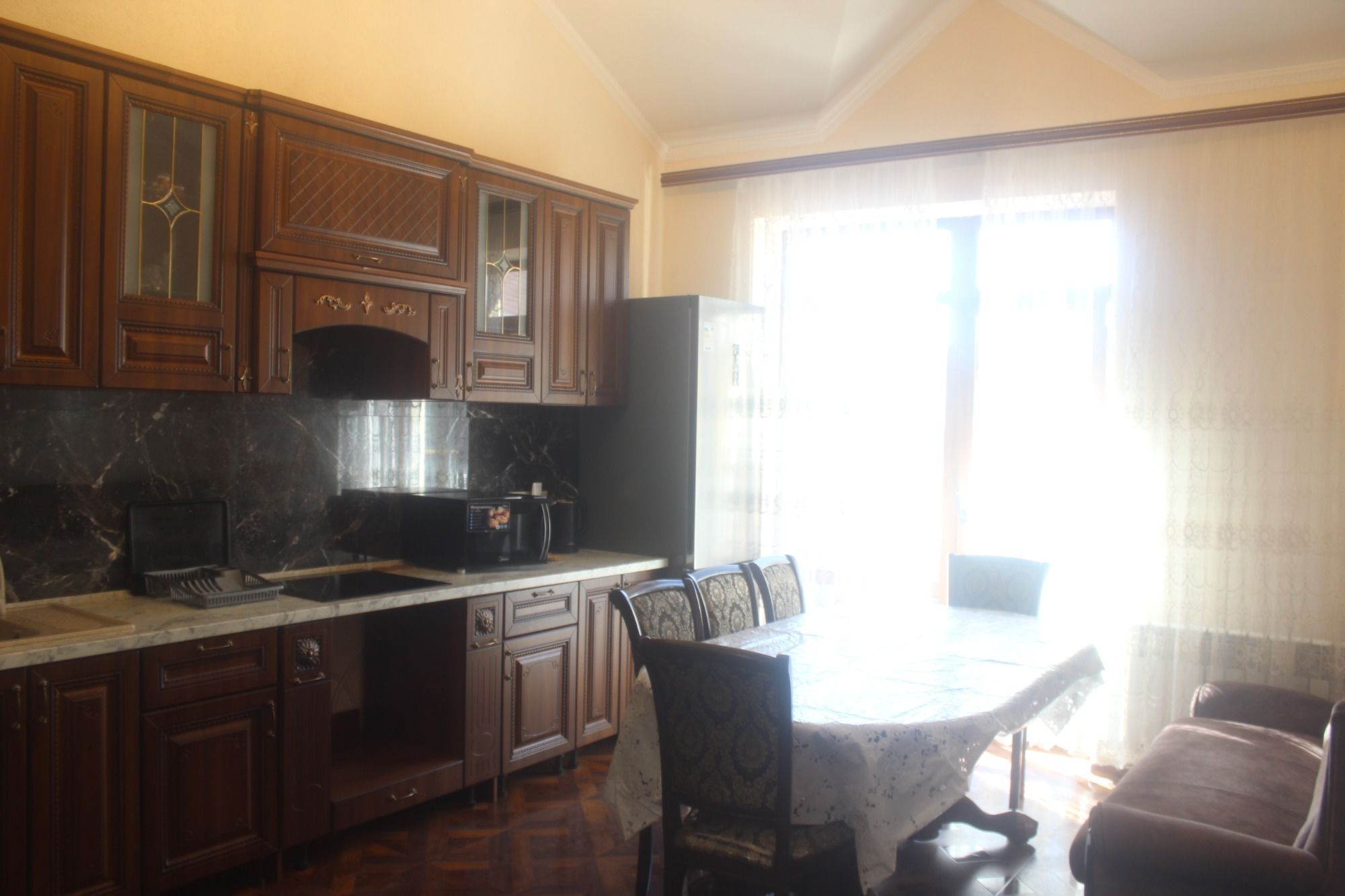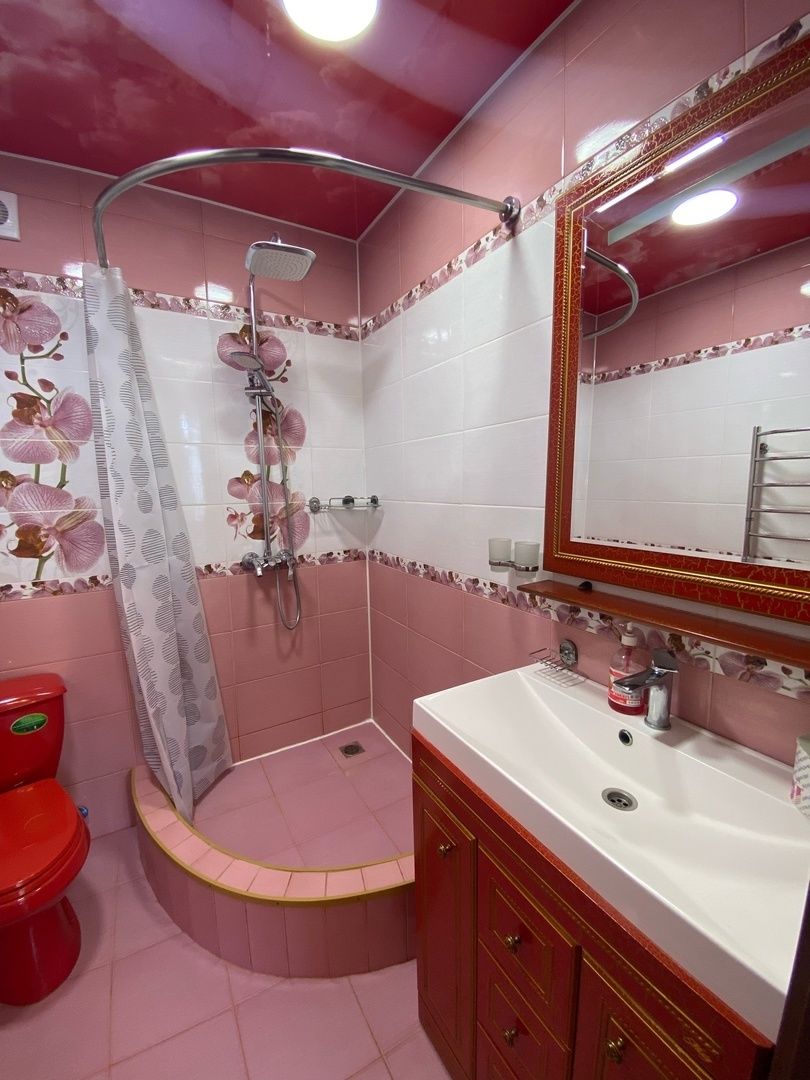 Для гостей подготовлены комфортабельные комнаты с балконом, кухней и ванной комнатой. В комнатах: двухспальная кровать, доп.место полуторка диван раскладной, тумбы, шкаф, ТВ, кондиционер и холодильник, микроволновка, чайник, вся необходимая посуда, WI-FI. На этаже гладильная доска и утюг. Есть возможность пользования стиральной машиной.