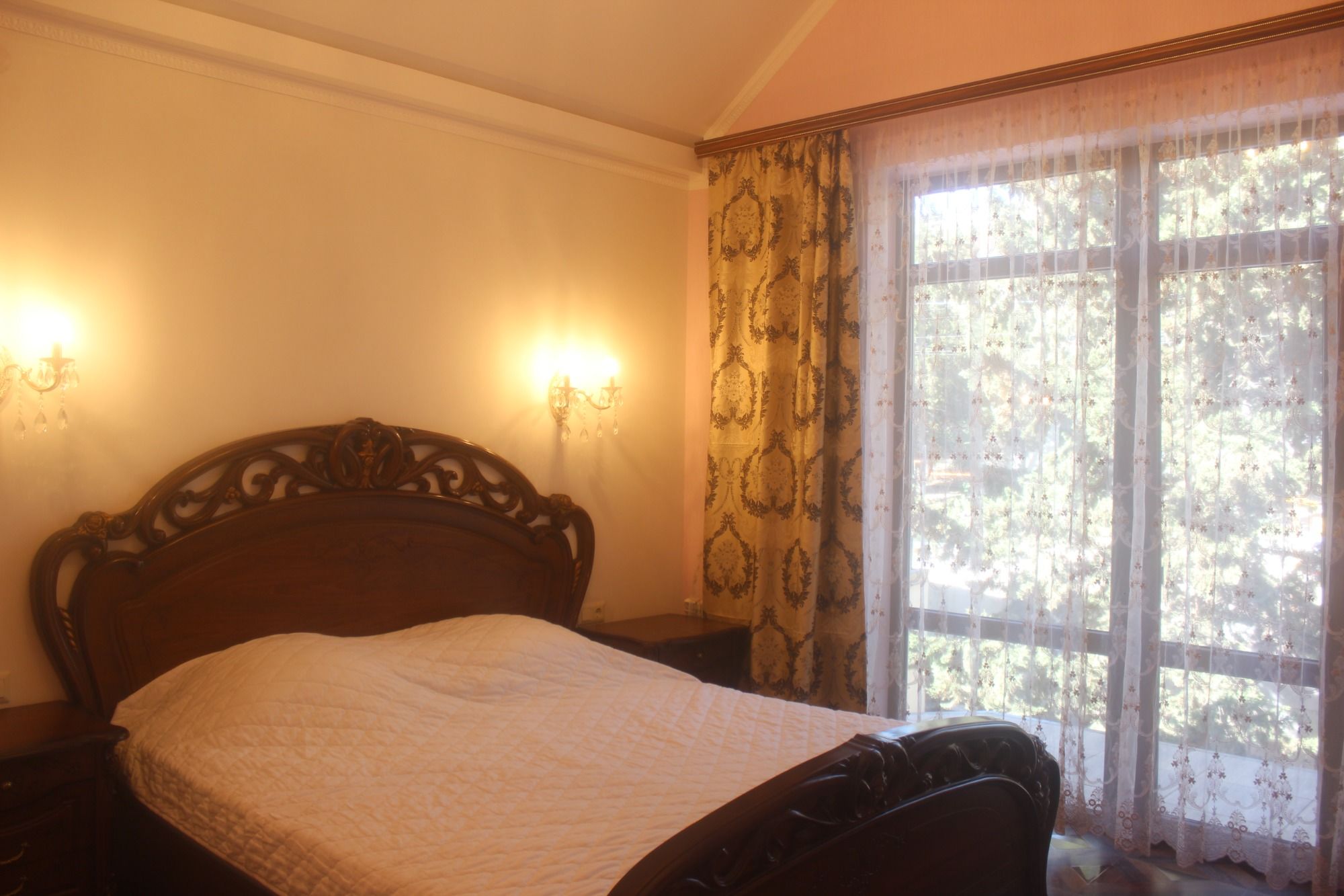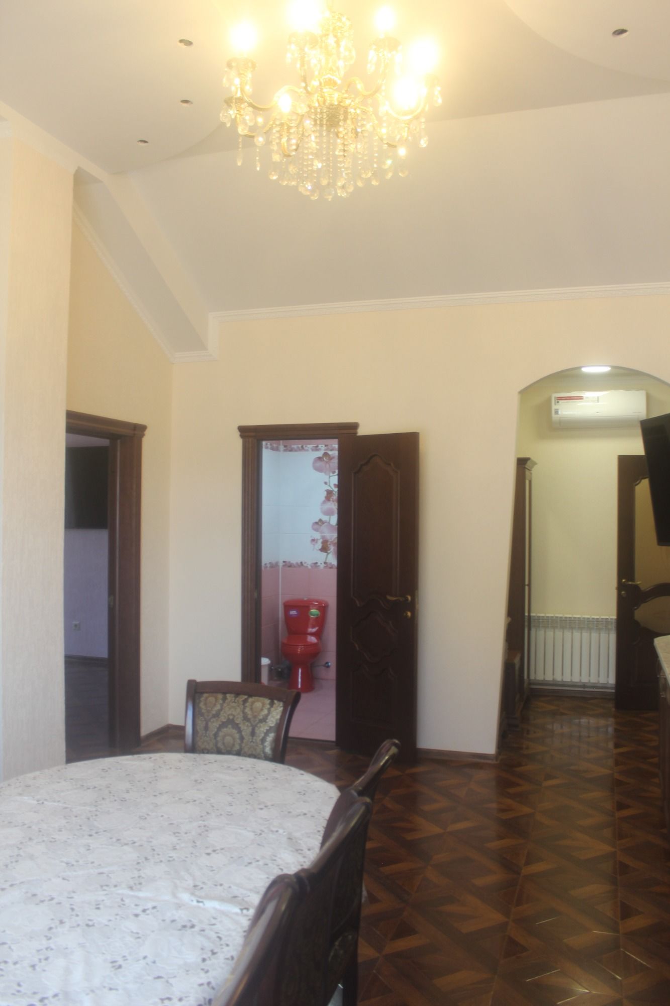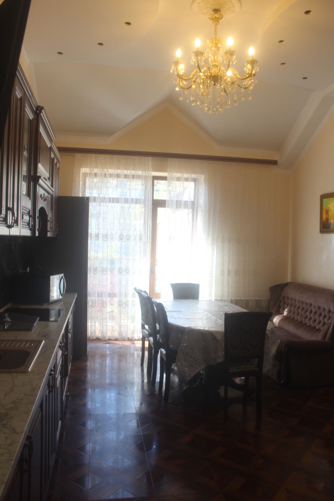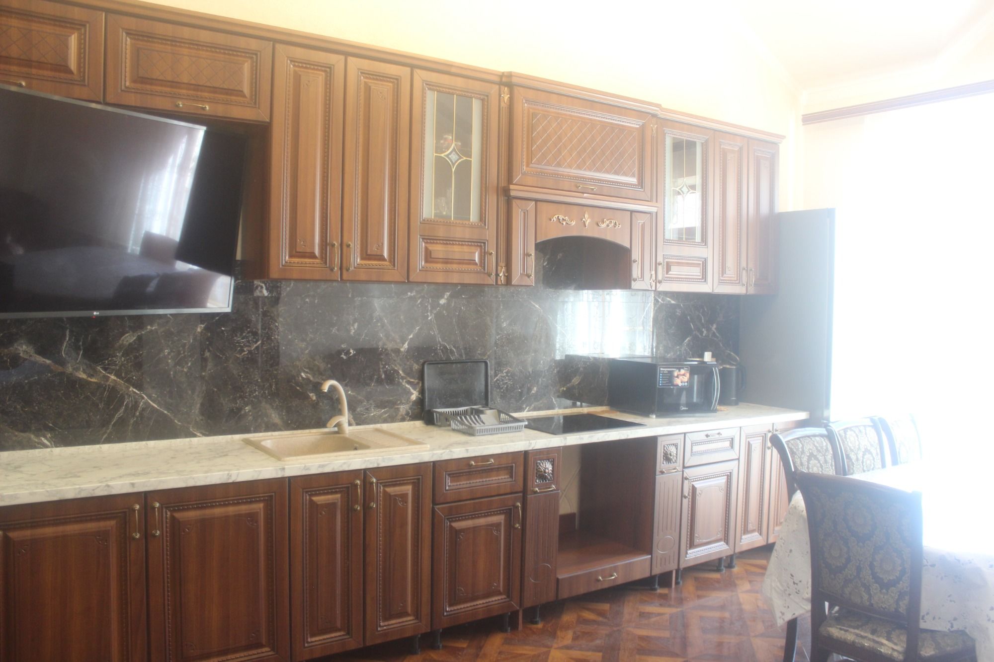 Для гостей подготовлены комфортабельные комнаты с балконом, кухней и ванной комнатой. В комнатах: двухспальная кровать, доп.место полуторка диван раскладной, тумбы, шкаф, ТВ, кондиционер и холодильник, микроволновка, чайник, вся необходимая посуда, WI-FI. На этаже гладильная доска и утюг. Есть возможность пользования стиральной машиной.