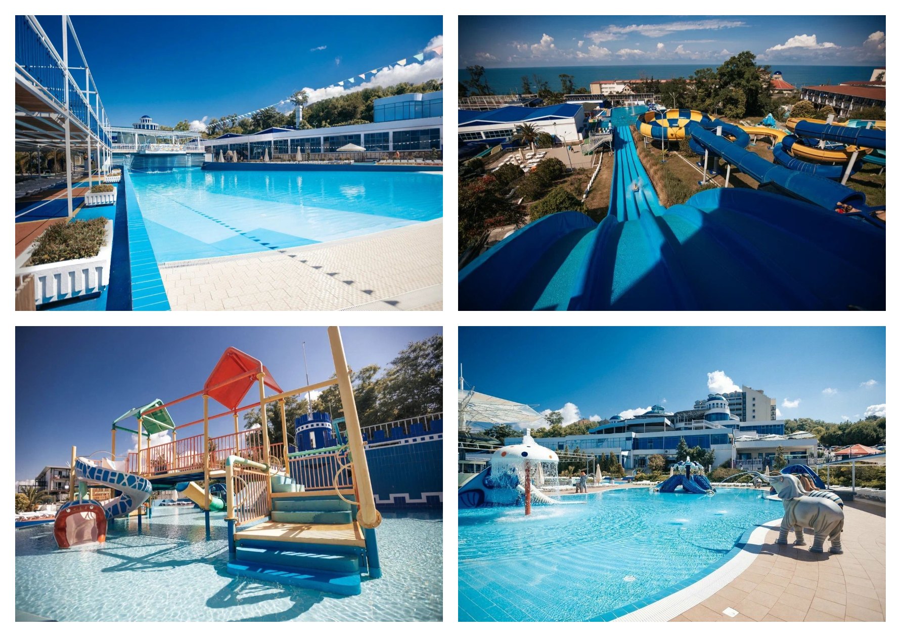 - три бассейна глубиной до 60 см, оборудованные мини-водопадами и горками для детей до 7 лет, такими как «Зайчик», «Радуга» и «Осьминожек». Эти горки украшены ветряками, барабанами и другими вращающимися элементами, что делает их еще более привлекательными для малышей;