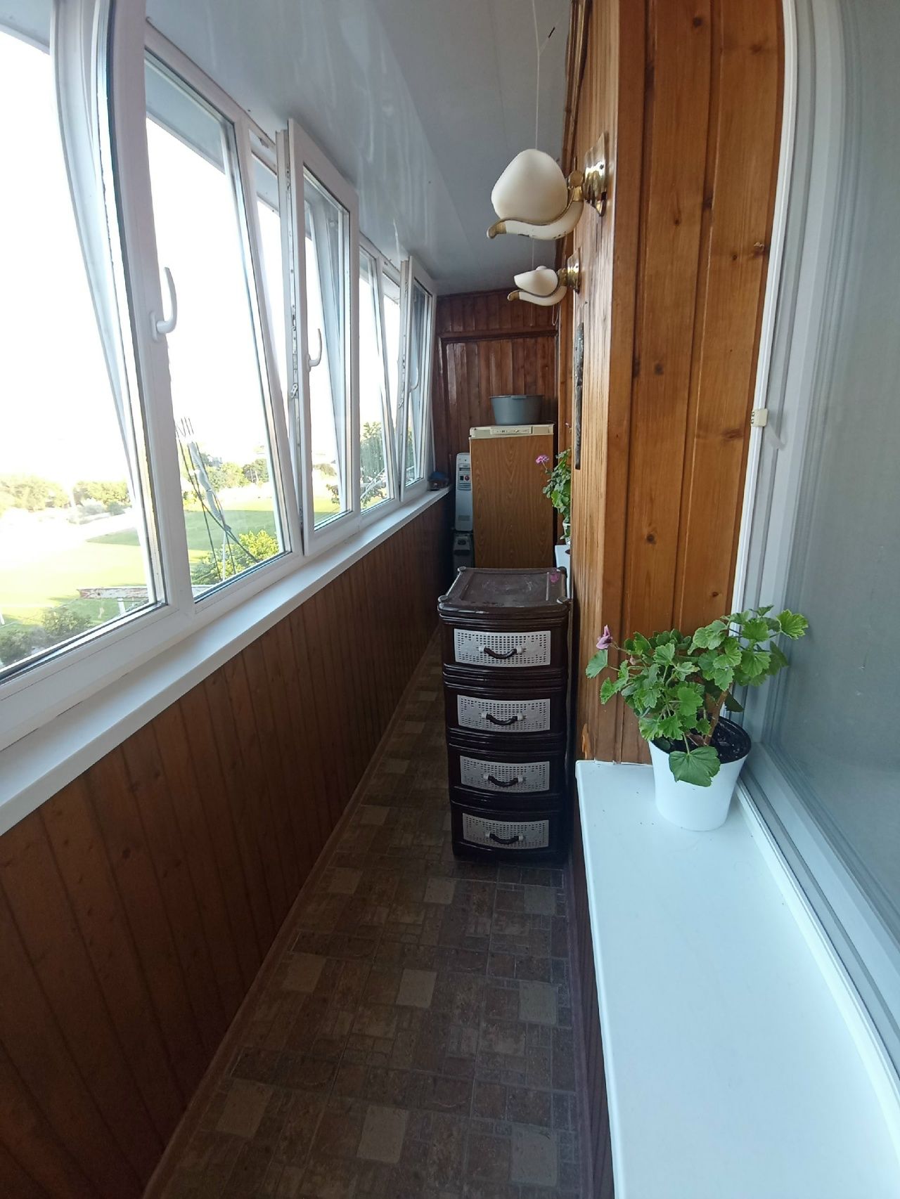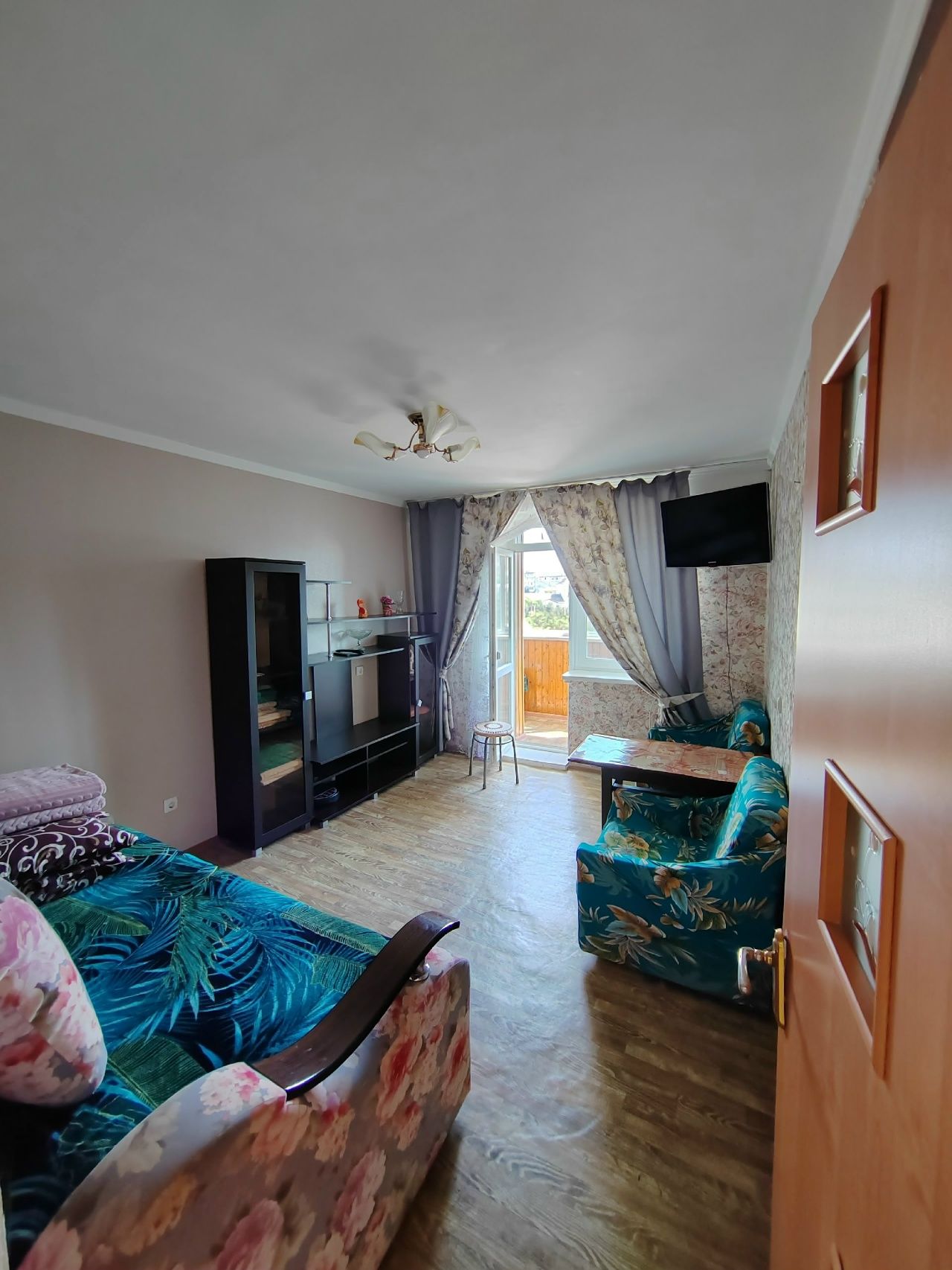 В квартире две раздельные комнаты, два телевизора, два дивана, один кондиционер в правой комнате, одна евро раскладушка, на балкон выход их двух комнат, есть вай-фай. Балкон с боковым видом на море, этаж 5.