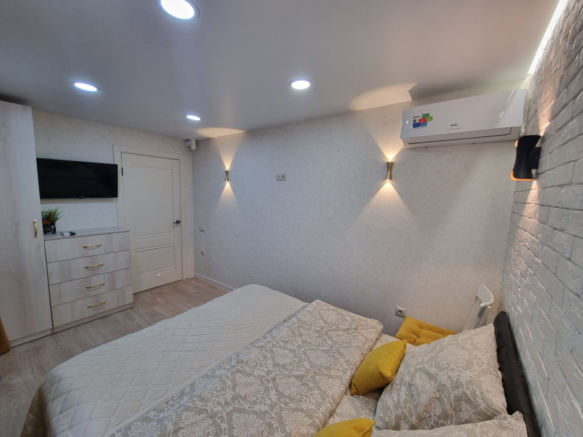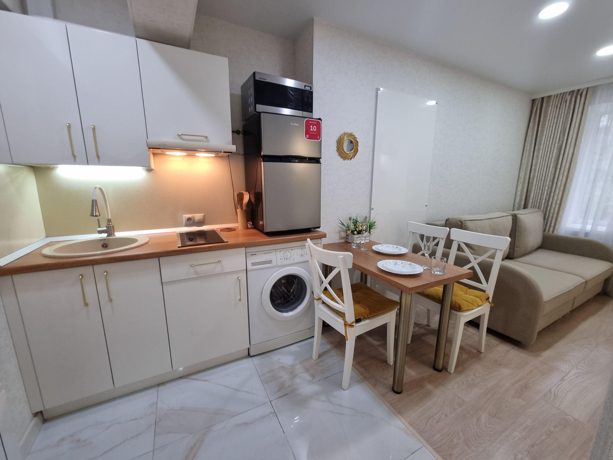 Квартира имеет свой отдельный вход и располагается в общем дворе. Есть вся необходимая техника и мебель: двуспальная кровать и раздвижной диван, холодильник, стиралка, микроволковка, телевизор.