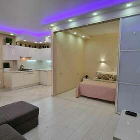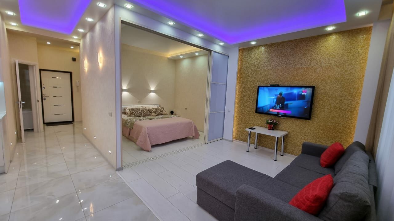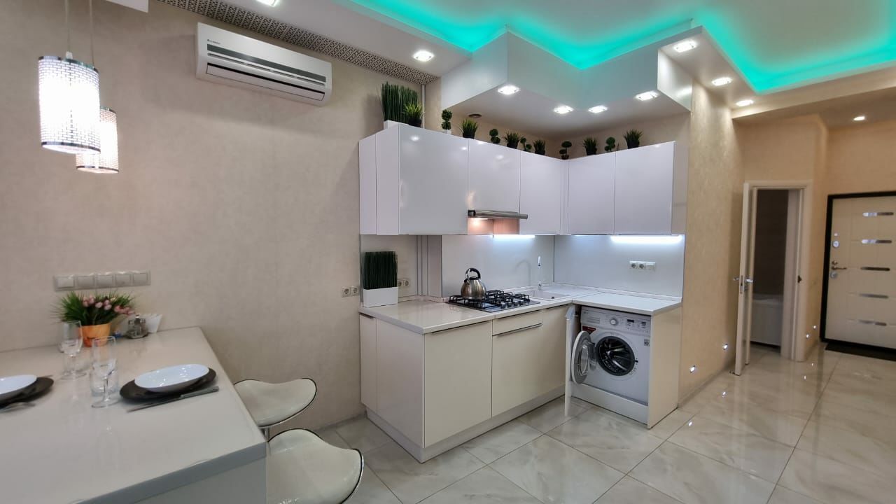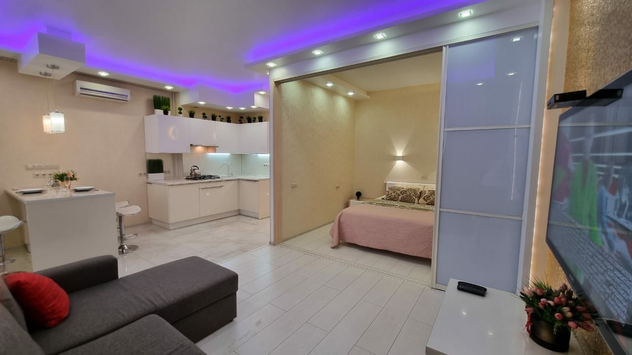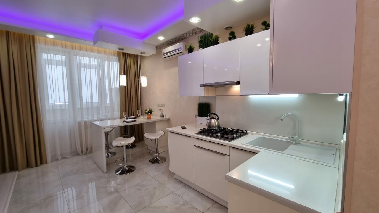 Шикарная квартира с дайнерским евроремонтом, мебелью и всей необходимой бытовой техникой в новом доме. Двухуровневые потолки с подсветкой, встроенная кухня, вся мебель новая. Спальные места: большая двуспальная кровать и раскладной двуспальный диван. К Вашим услугам безлимитный интернет WI FI, СВЧ, варочная панель, холодильник, вся необходимая кухонная посуда, стиральная машина-автомат, сушка для белья, фен, утюг и т.д.