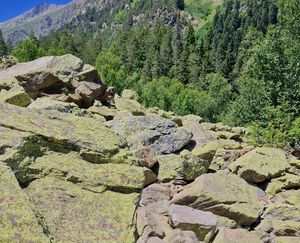 Еще через 800 метров начинаются курумники – каменные россыпи и груды валунов, напоминающие "реки" с четким руслом. Дорога продолжается по этим завалам, и для ориентирования используются красные метки на камнях. Здесь важно соблюдать осторожность, чтобы не оступиться и не получить травму.