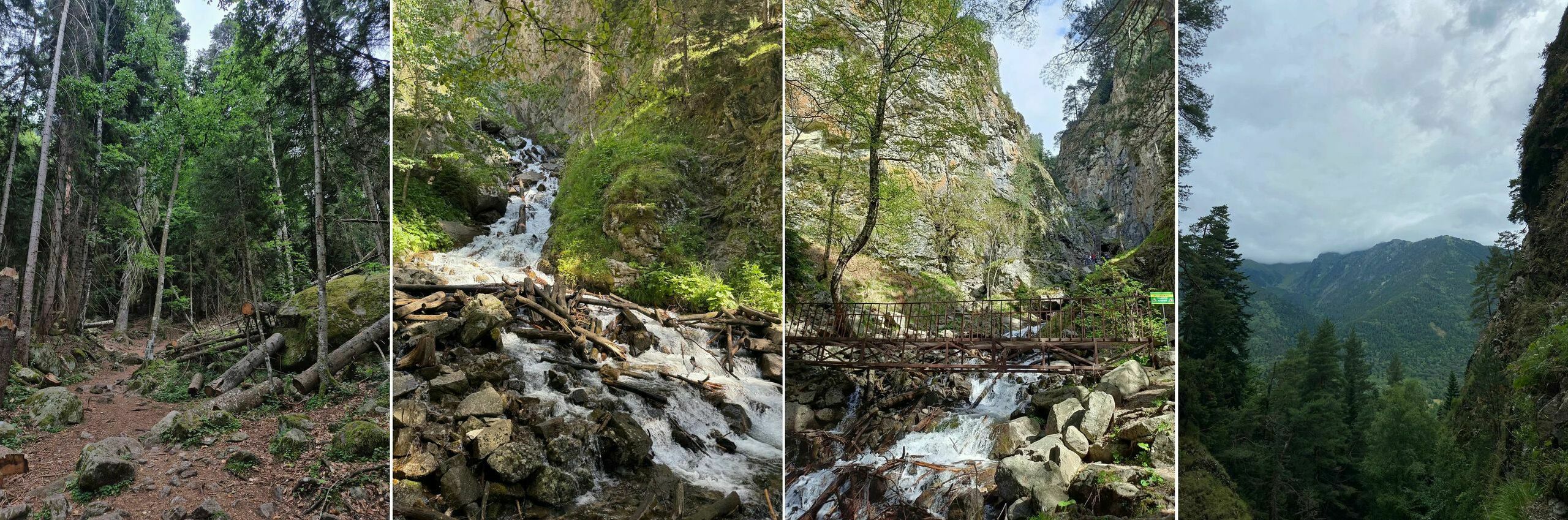 На начальном этапе дорога идет по левому берегу реки, а ближе к водопаду встречаются крупные валуны. Этот участок считается наиболее сложным, и после него необходимо перейти на правый берег реки. Для этого предусмотрены два моста: старый бревенчатый и новый железный. Уже здесь можно услышать шум водопада, который становится все громче по мере приближения к цели.