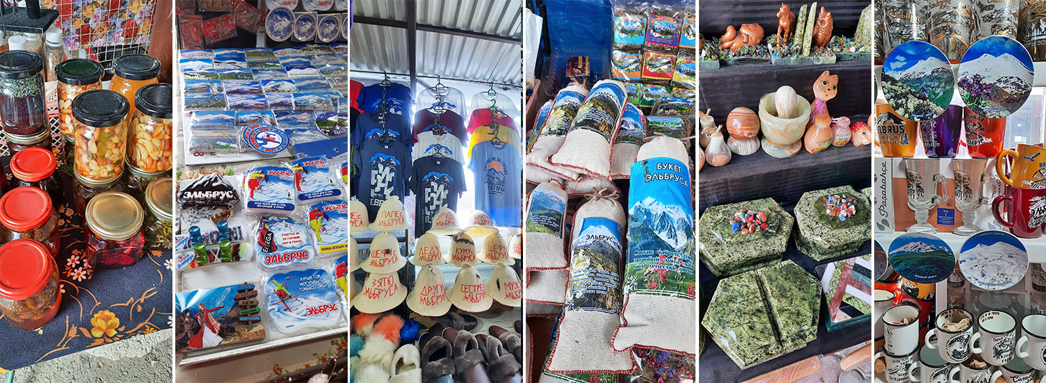 Терскол славится своими сувенирами из овечьей шерсти и козьего пуха, такими как носки, шарфы, тапочки и коврики. Туристы также покупают вяленую баранину, наборы чая из горных трав, магниты, значки и кружки с изображением Приэльбрусья. Перед отъездом домой многие приобретают домашние сыры, пастилу и мед. Самый большой выбор сувениров можно найти на стихийных базарах у полян Чегет и Азау.