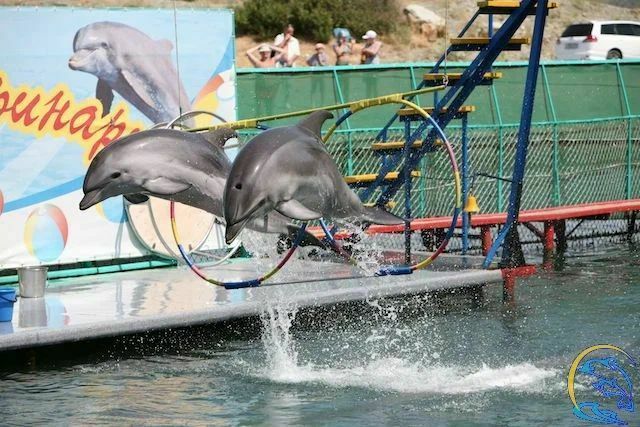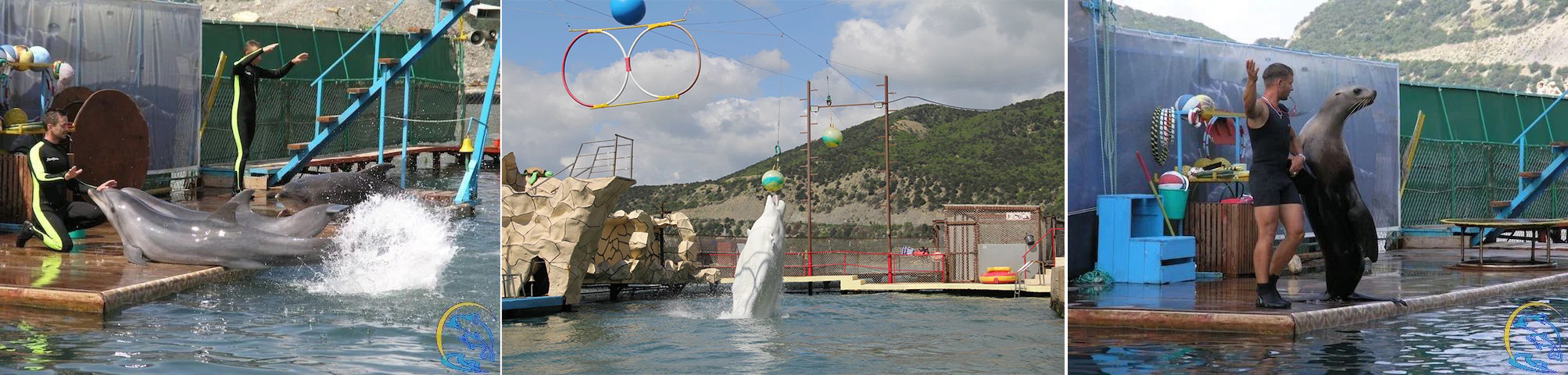 Вольеры с животными располагаются в лагуне с проточной морской водой под открытым небом, где и проходят представления. Для зрителей на берегу моря расположены трибуны под навесом, откуда открывается вид на Черное море, горы Кавказского хребта и реликтовый можжевеловый лес. Видимость из любого места великолепная.